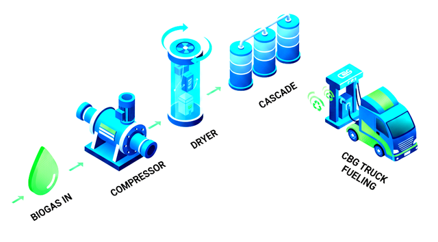 Purified biogas is compressed into CBG using high-pressure compressors.