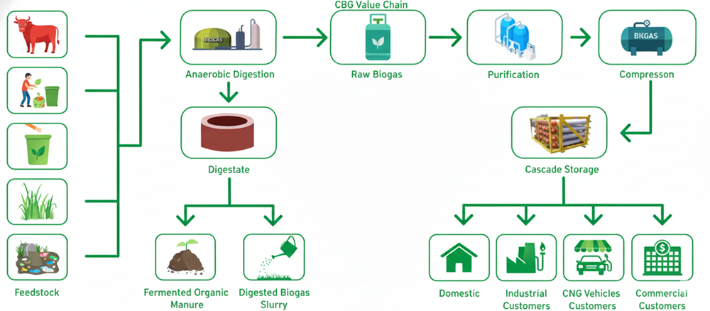 CBG (Compressed Bio Gas) is produced through the anaerobic digestion of agricultural residue, cattle dung, sugarcane press mud, MSW, sewage waste and industrial organic residue. The resulting biogas is purified to remove CO₂, H₂S and moisture, achieving **methane content above 90%**, then compressed up to **250 bar** for bottling.