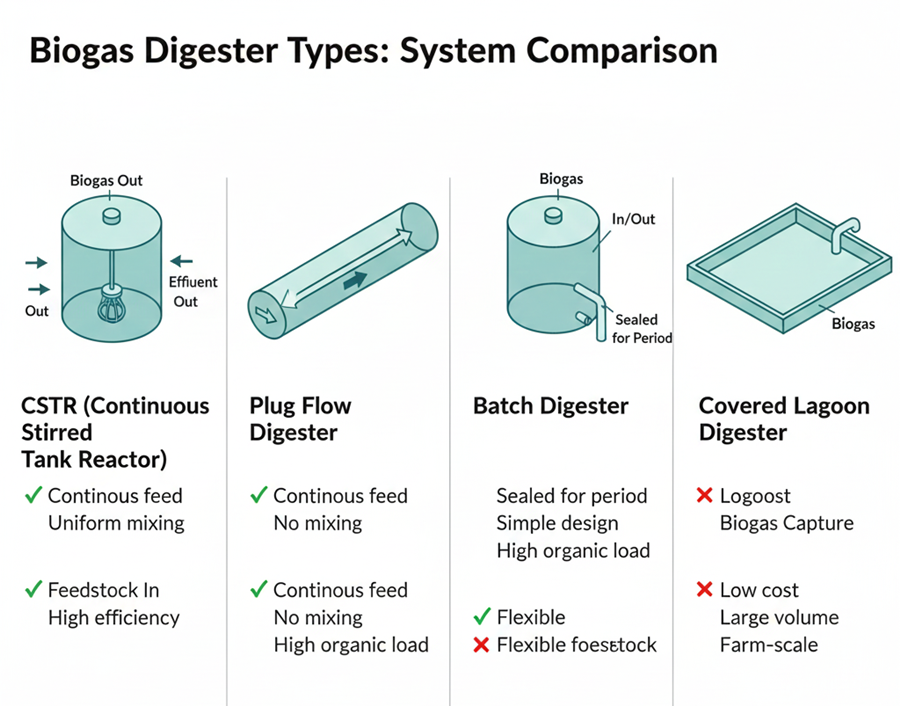 Different types of digesters used to convert organic biomass into biogas efficiently.